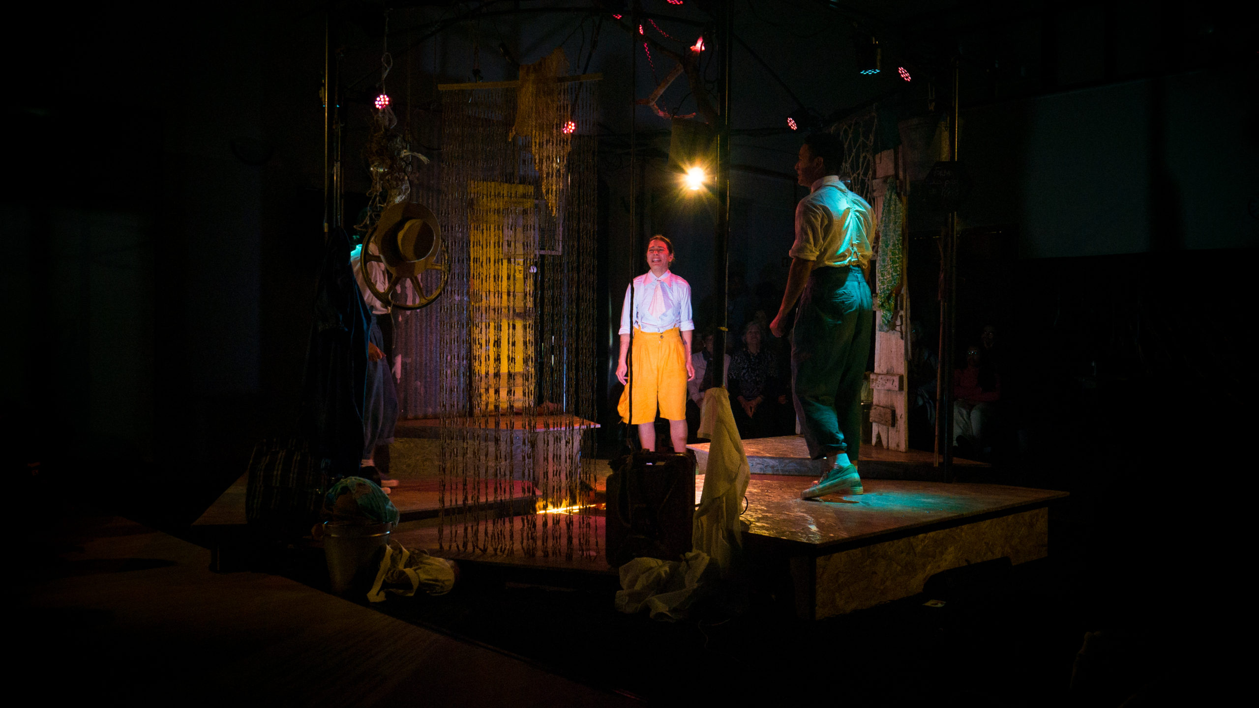 Prosseguindo com o propósito de capacitação e profissionalização de uma nova geração de atores no algarve, mauro coelho e rafaella ambrozio (provenientes do sincera, grupo de teatro da universidade do algarve) juntam-se a beatriz medeiros, dando corpo às diversas personagens por meio de mudanças rápidas de figurinos e manipulação de objetos e adereços – à vista de todos- num cenário atípico que os encapsula, e onde toda ação decorre.