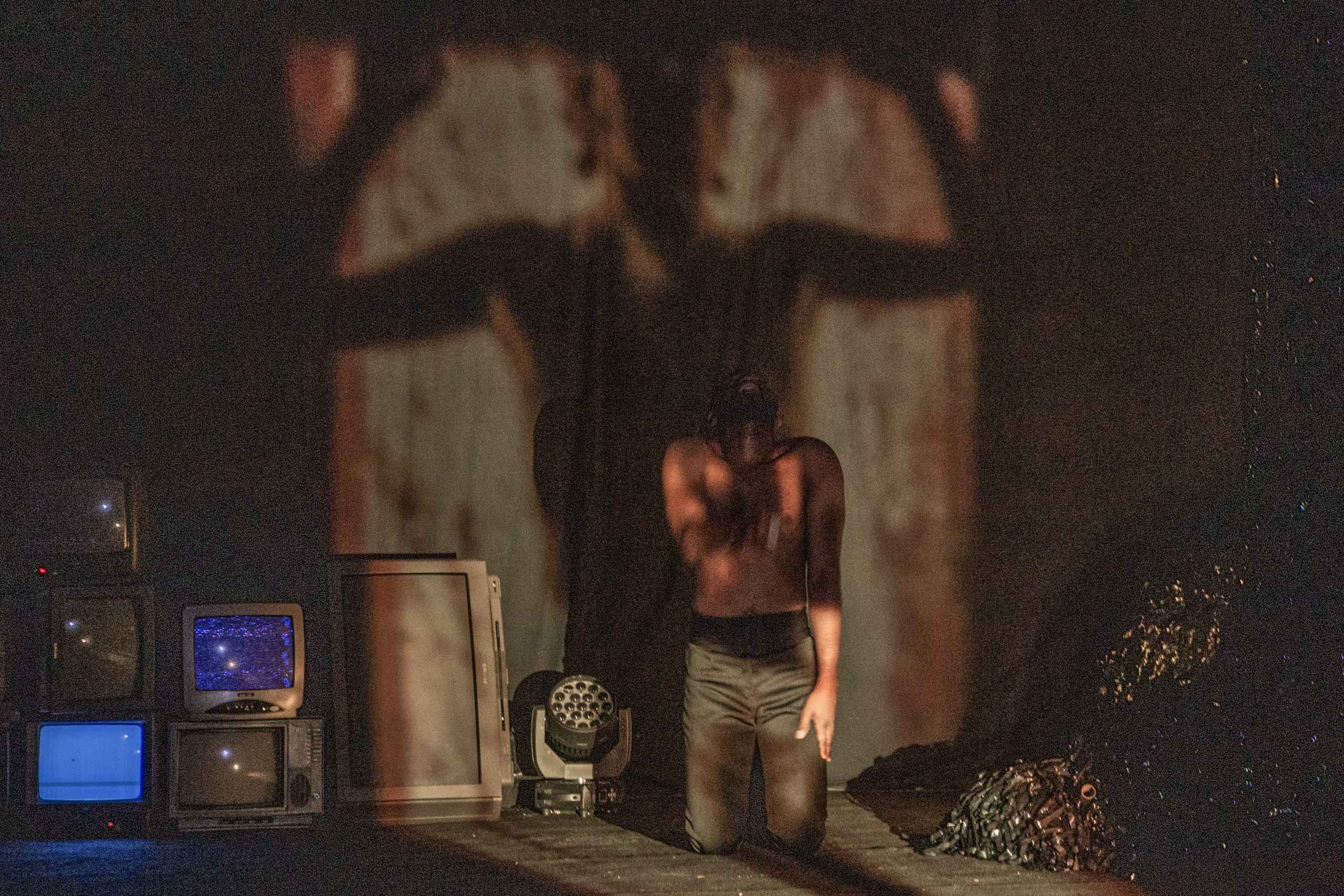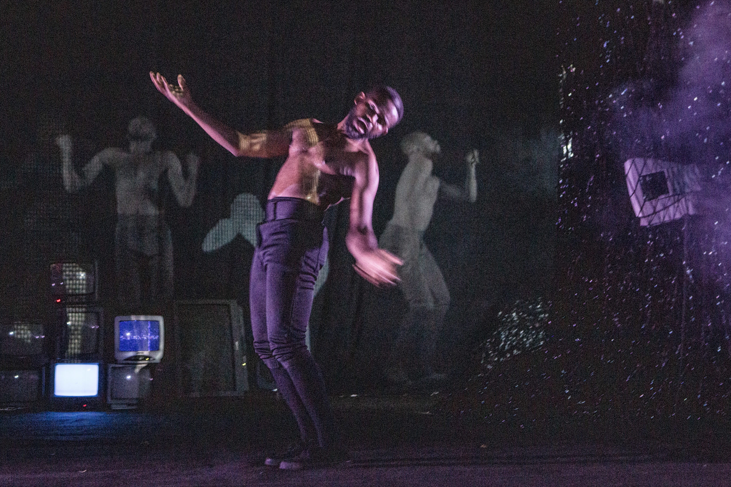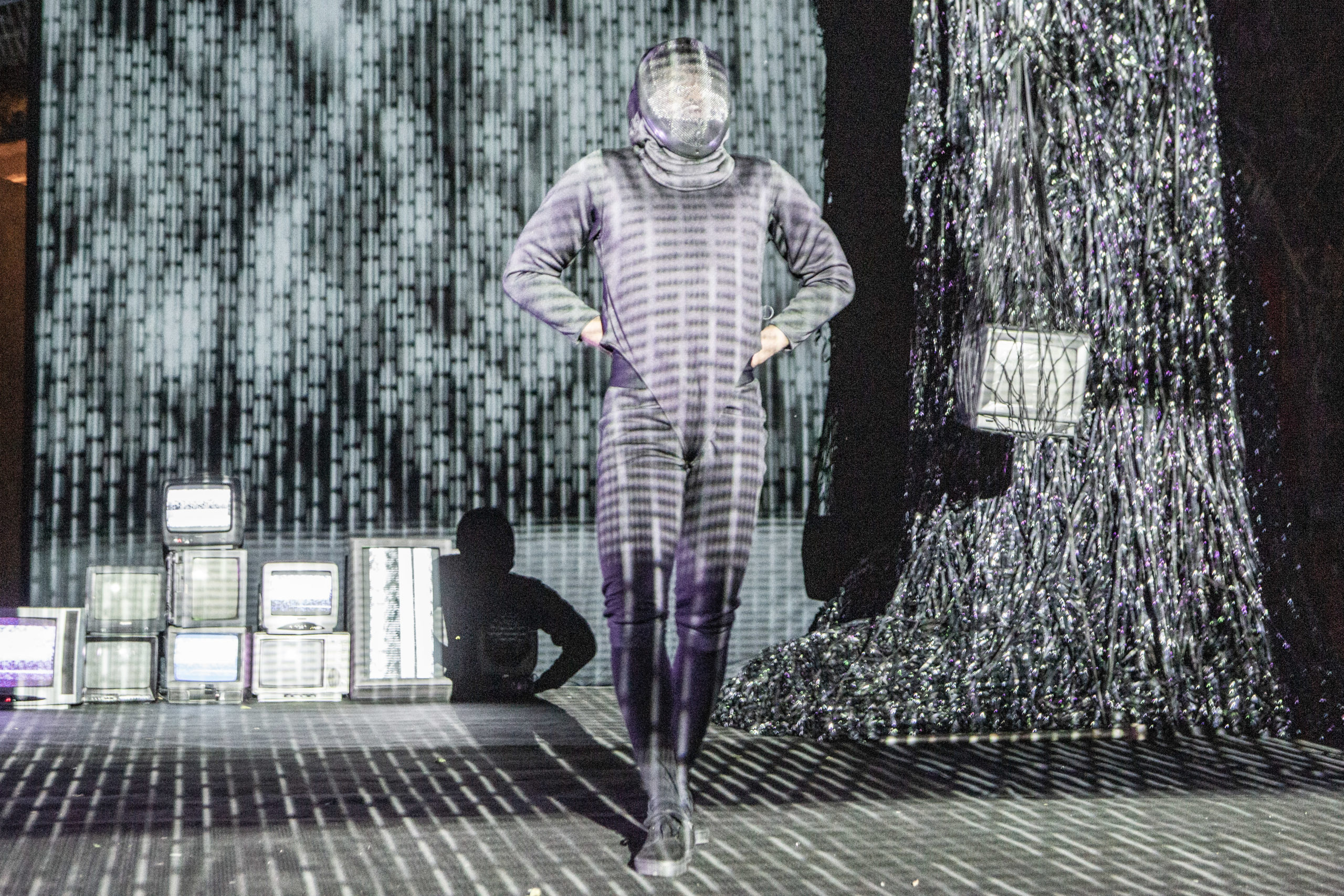 Television screens, slides, video projection, and body movement mapping that accompanies the actor’s choreography in real time are elements that combine with electronic music to create an immersive environment where video dance gives the viewer a glimpse of a possible future.